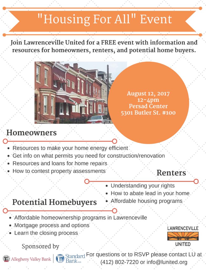 The Lawrenceville “Housing for All” Event & Workshop starts promptly at 12 noon on Saturday 8/12 at the Persad Center (5301 Butler Street, Suite 100) and will last until 4 PM with a full day of presentations, discussions, and resources related to housing for renters, homeowners, and prospective homebuyers. Free lunch, childcare, and LED lighbulb & nightlight giveaways from Duquesne Light. Topics include renters rights, affordable homeownership programs in Lawrenceville, a legal panel, weatherization programs, abating lead in your home, and much more. Please see flyer and schedule below for more information.